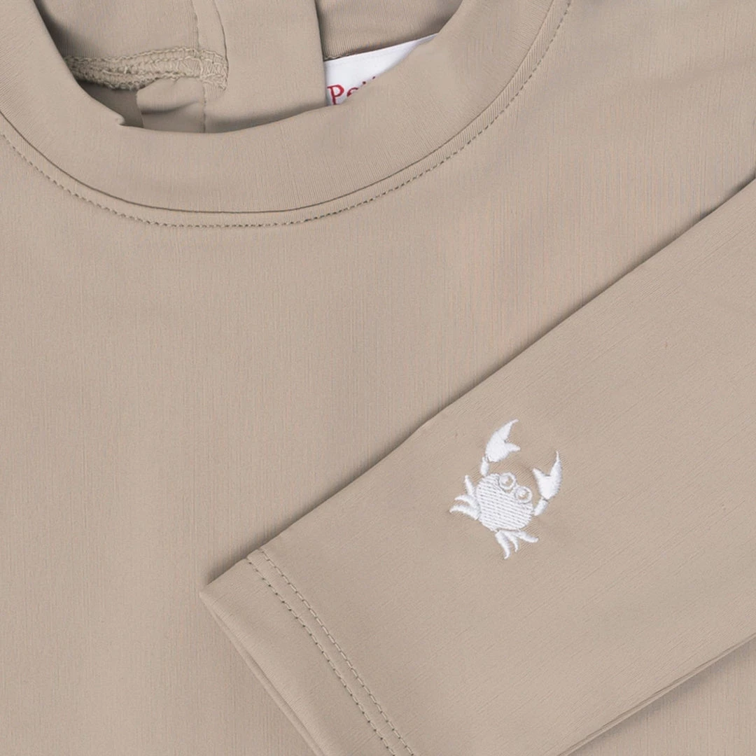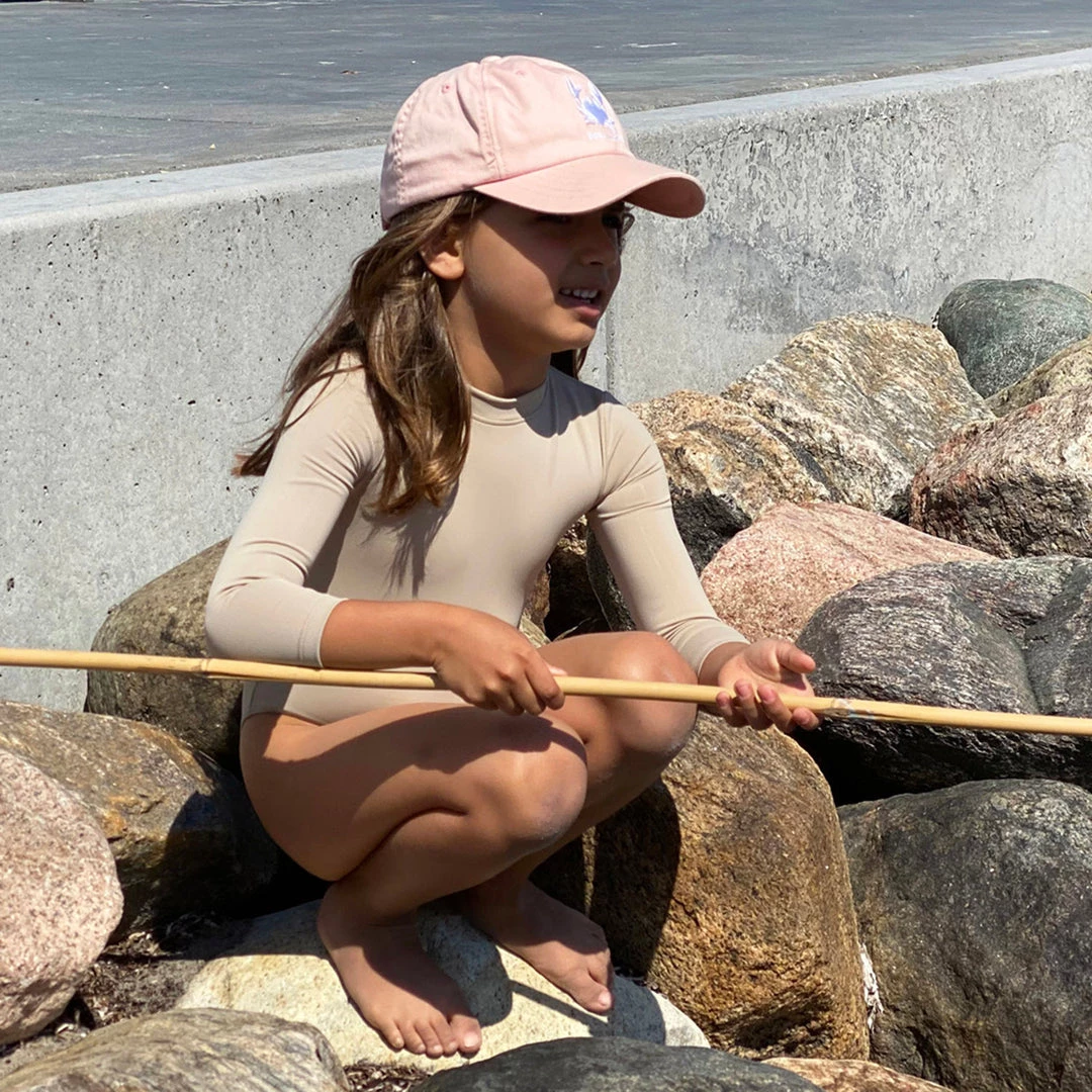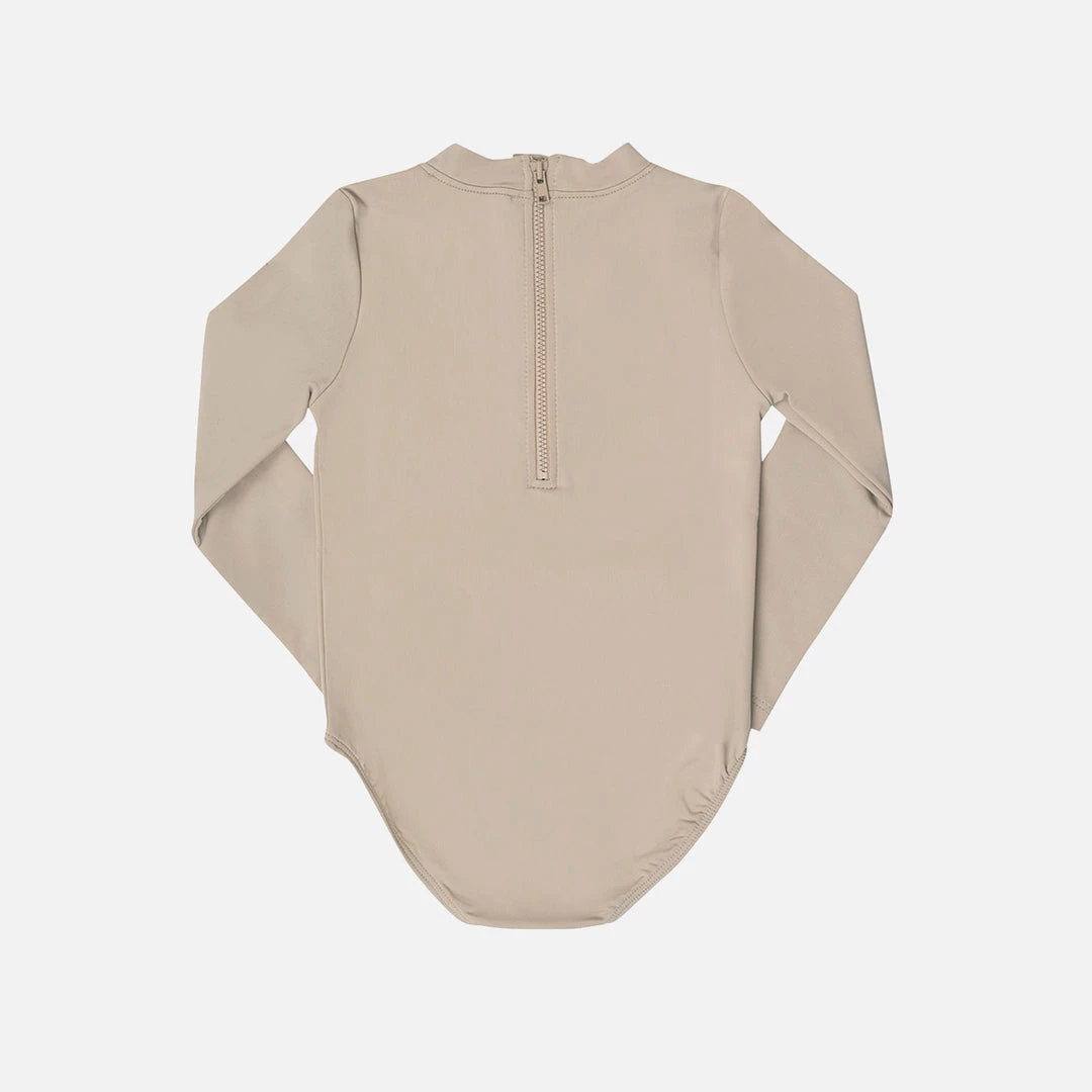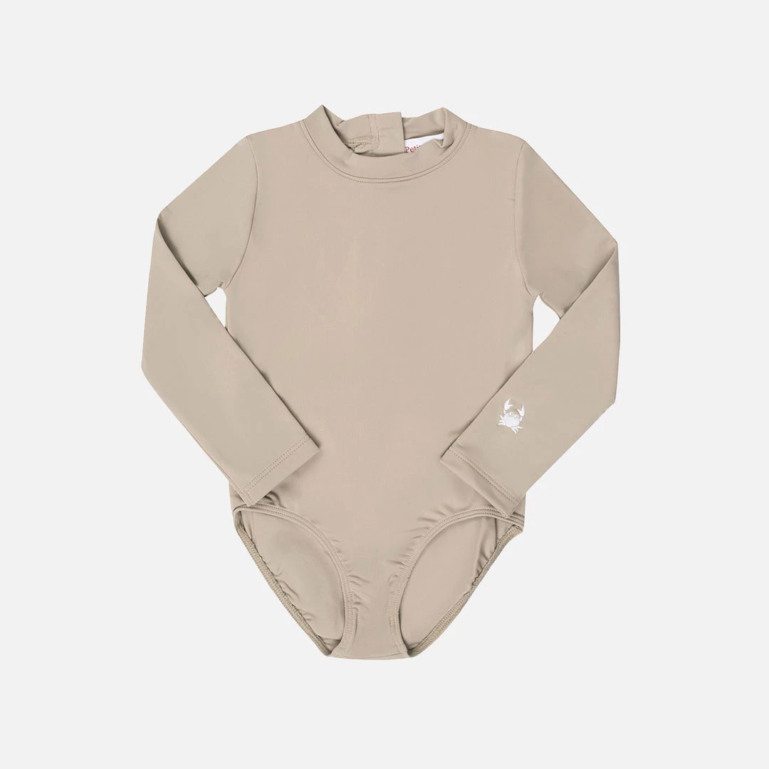 A long sleeved swimsuit with white crab embroidery on the sleeve. Designed with a zipper fastening at the back.