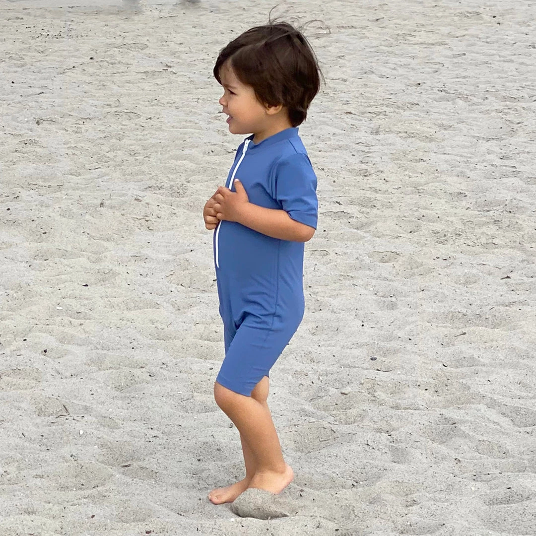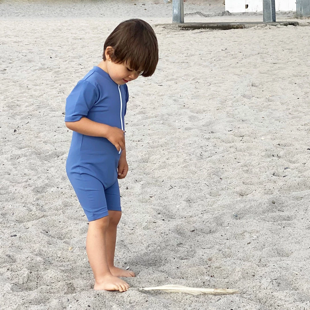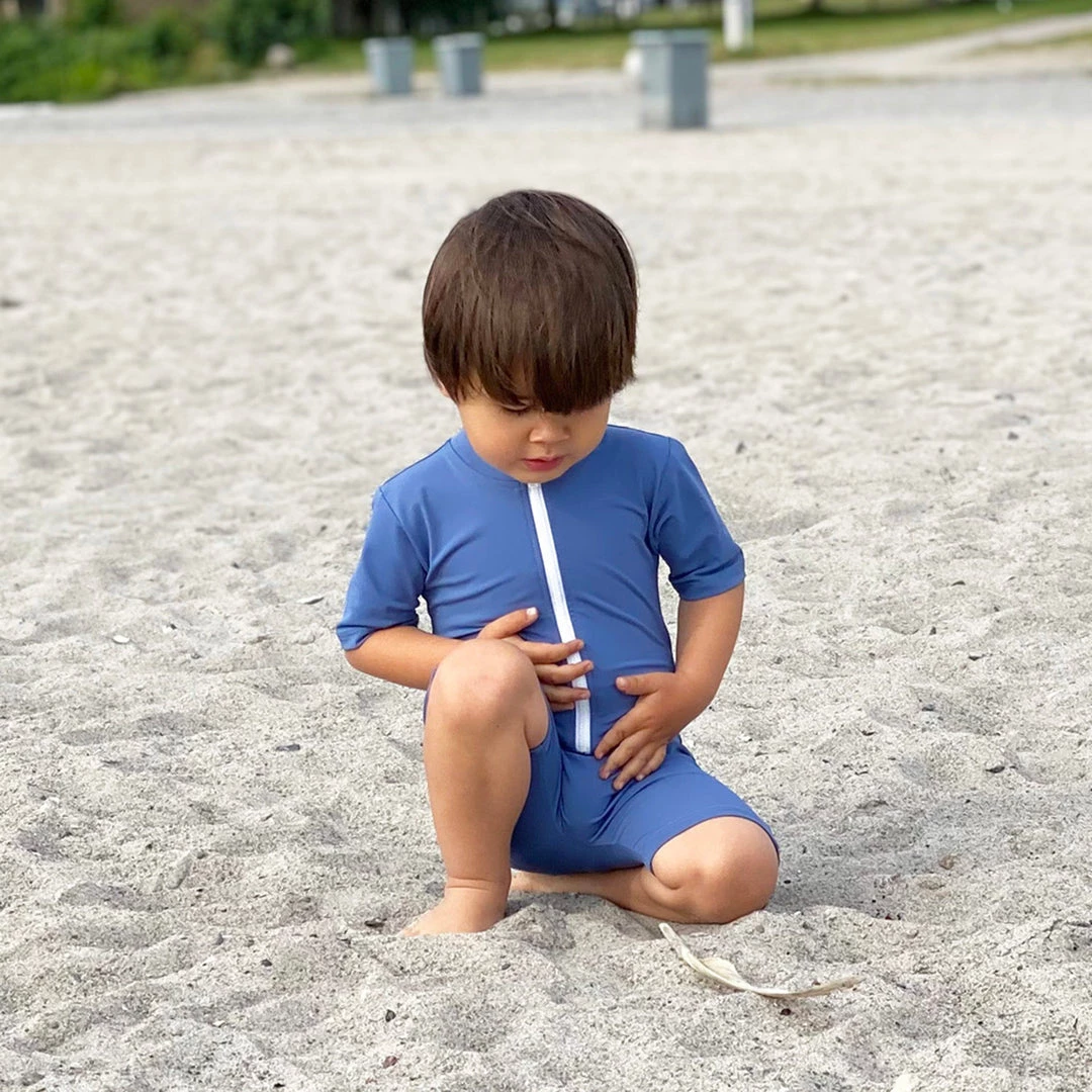 A great UV body suit for a day playing on the beach. Designed with short sleeves and legs for those who want protection from the sun’s rays. This sunsuit is without an appliqué on the back, it is solid colour all over. Combine this suit with a hat for maximum sun protection. Easy open front with a YKK zip and zip protection flap.