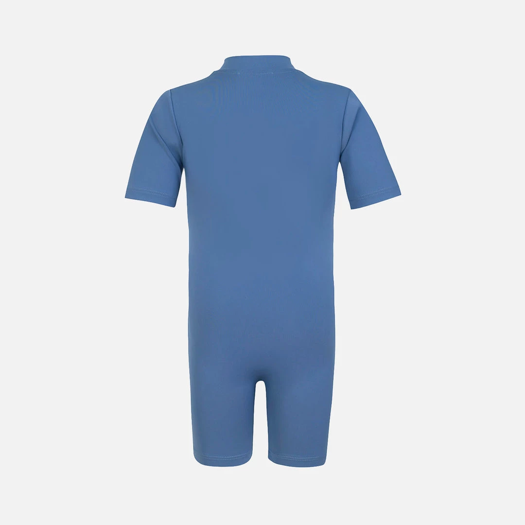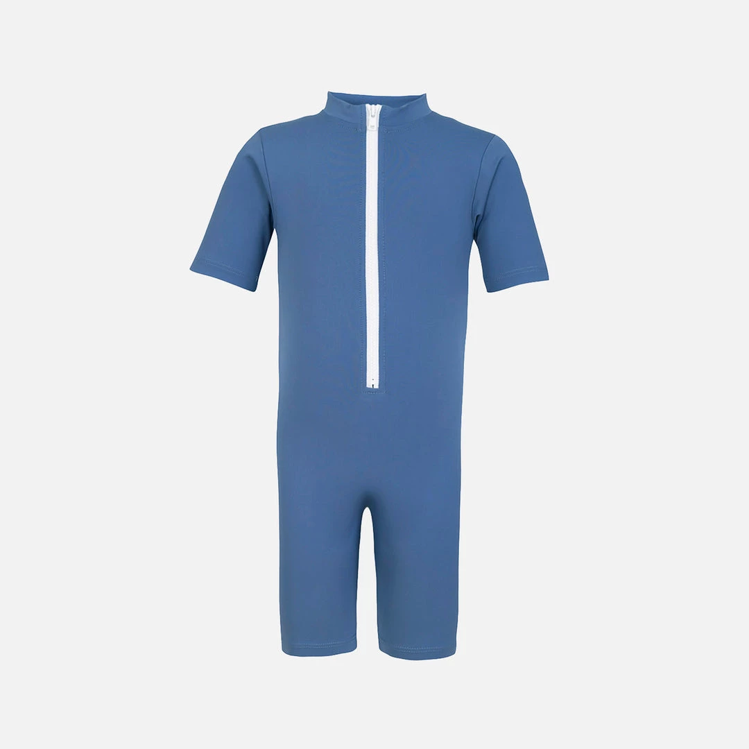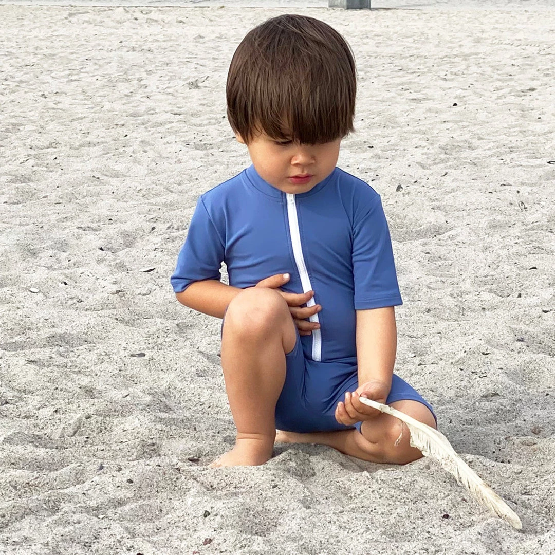 A great UV body suit for a day playing on the beach. Designed with short sleeves and legs for those who want protection from the sun’s rays. This sunsuit is without an appliqué on the back, it is solid colour all over. Combine this suit with a hat for maximum sun protection. Easy open front with a YKK zip and zip protection flap.