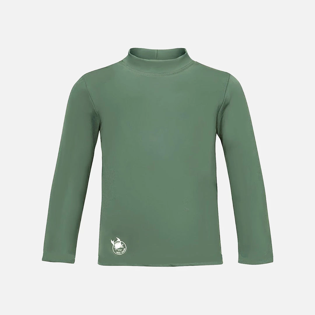 A Long sleeved swim shirt with a round neck, visible seams and round logo embroidery at the front. This is a great layering piece for days spent on the beach on swimming for extra sun protection.