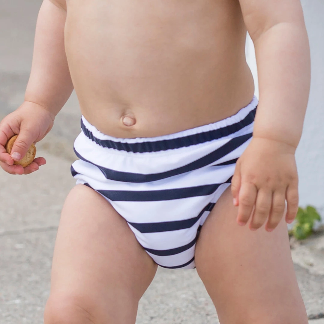 The outer fabric of the swim nappy is 80% Polyamide and 20% Elastane / Lycra with UPF 50+. The pants are lined with a soft 2-sided anti-leak fabric containing, respectively a layer of 100% polyester and a layer of 100% polyurethane. All fabric in the swim nappies is Oeko-Tex certified.
