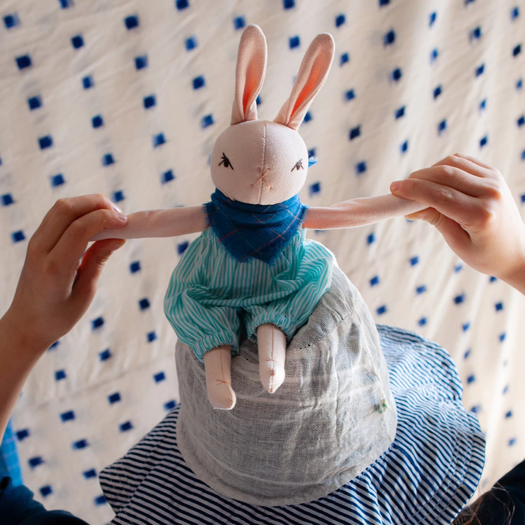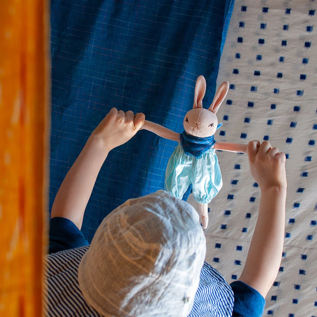 The small rabbits are beautifully handmade in cotton canvas. The cream and brown rabbits are wearing a cotton dress and a headscarf. The peach rabbit is wearing bloomers and a handwoven neckerchief. Hand embroidered face.