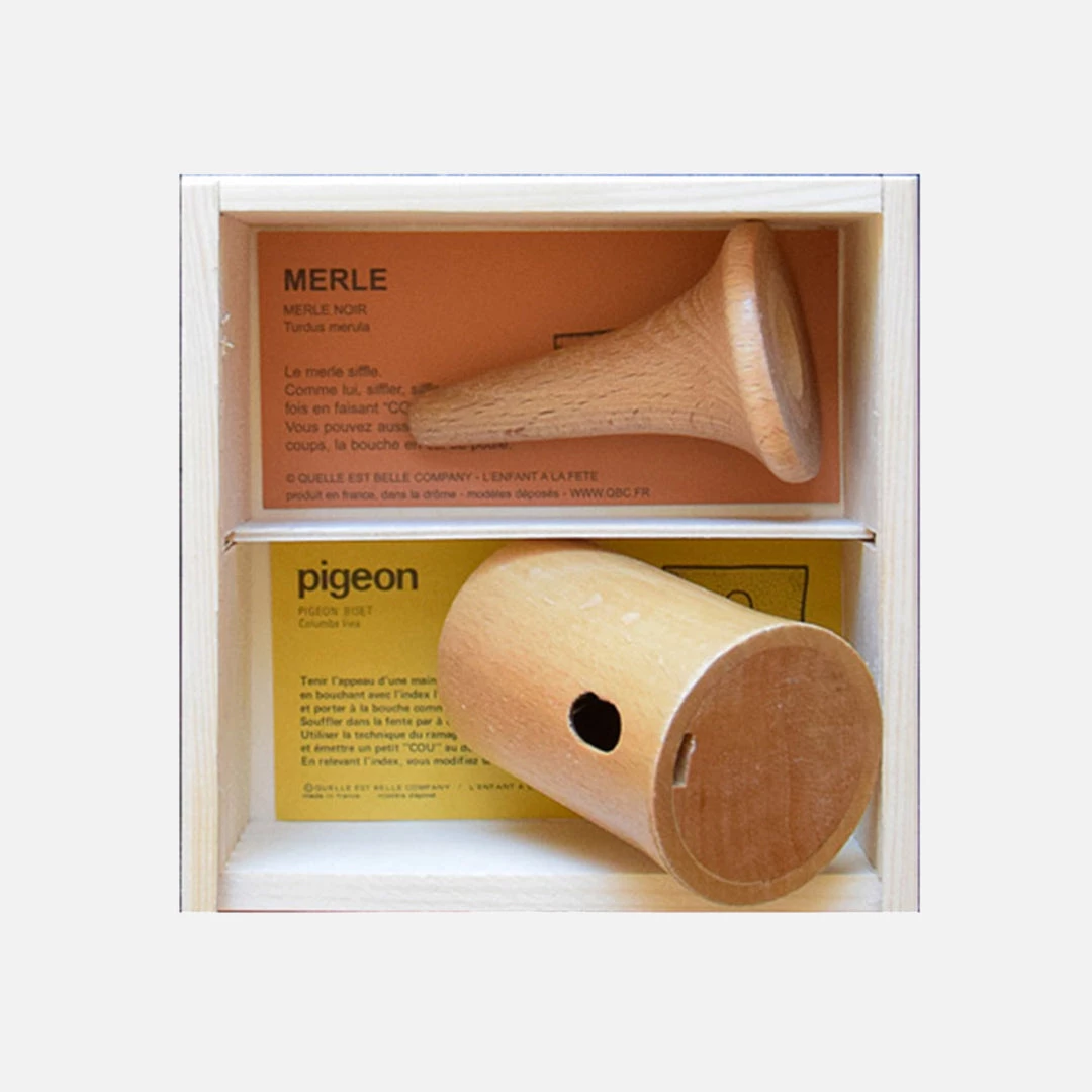 Each birdcall is packed in a small wooden box, featuring a picture of the bird on the front. The bird name and instructions for use are printed inside on the bottom.
