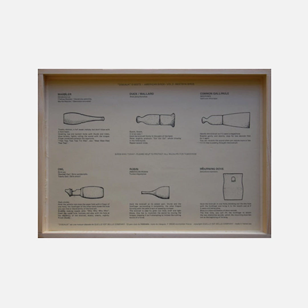 This is a set of 6 in a wooden gift box containing whistles and callers for a selection of American Birds. Warbler, Duck Mallard, Common Gallinule, Owl, American Robin and Mourning Dove. Made of polished boxwood.