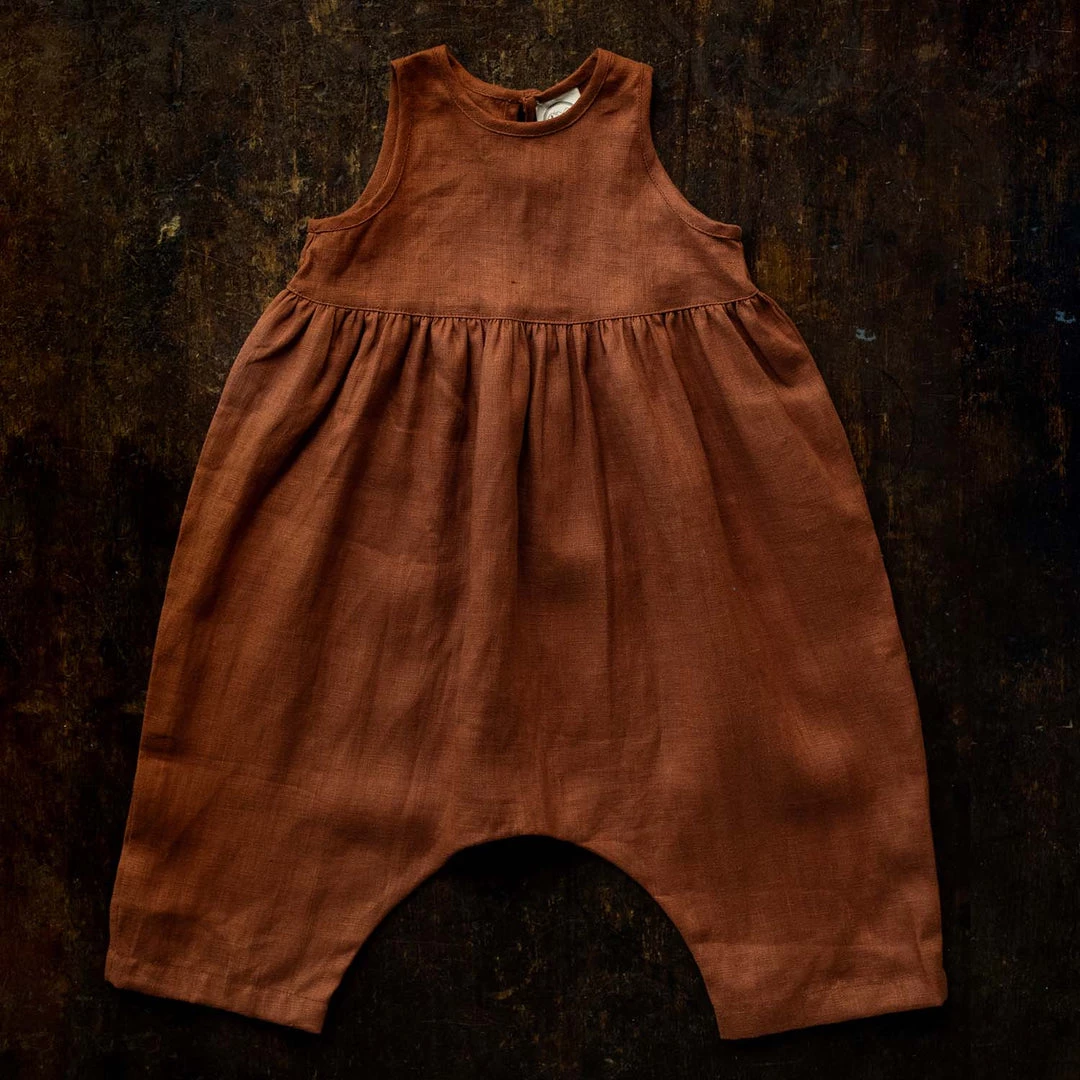 The Garden Jumpsuit is a sweet romper that will take you through the seasons. Wear on its own in the warmer months or wear over a base layer and with a cardigan in the cooler temperatures. This is an easy to wear, one piece slip on jumpsuit. It has bias binding on the neck and arms with a single button closure at the back. A gathered waist and harem style pant allows for plenty of room to move and play in. French seams throughout.