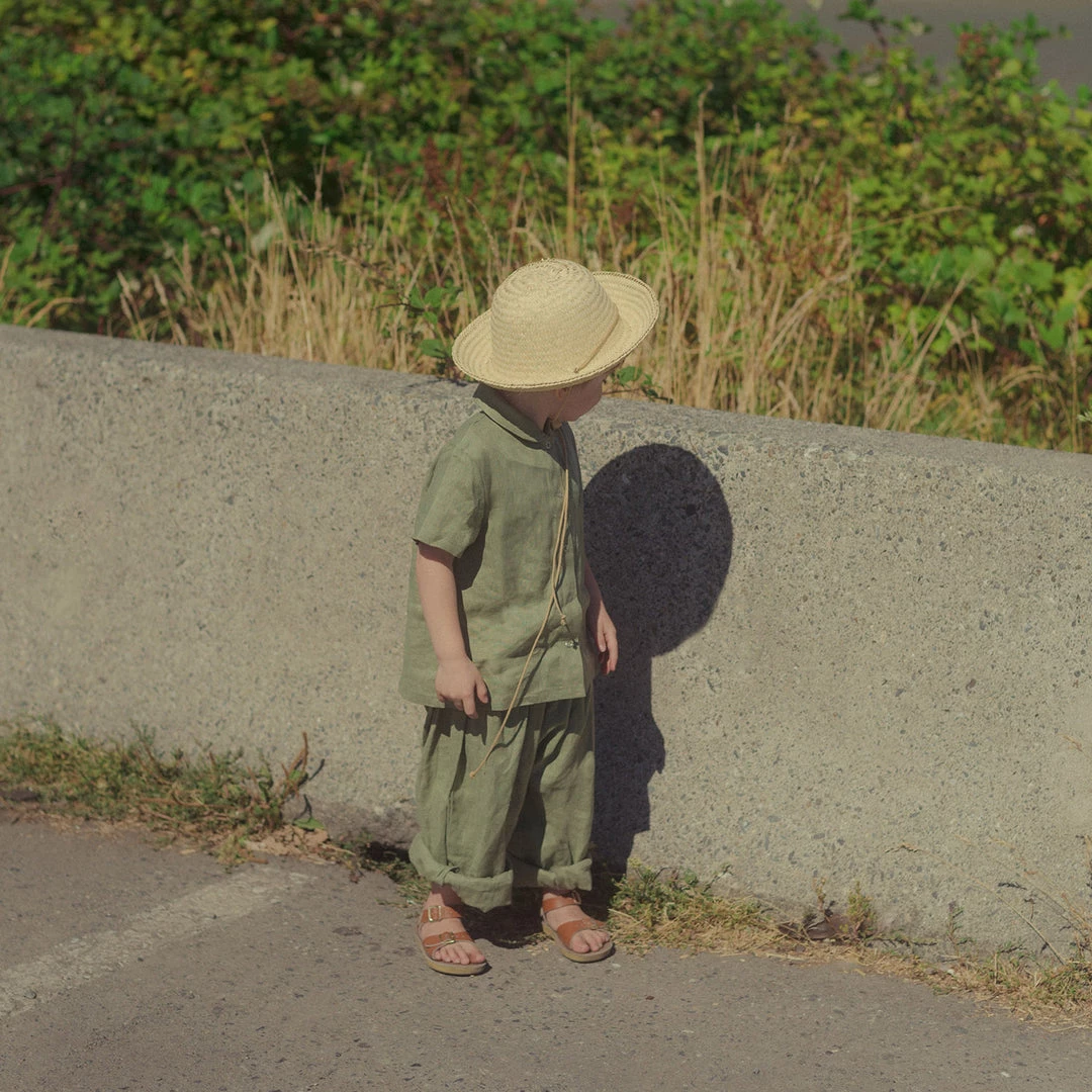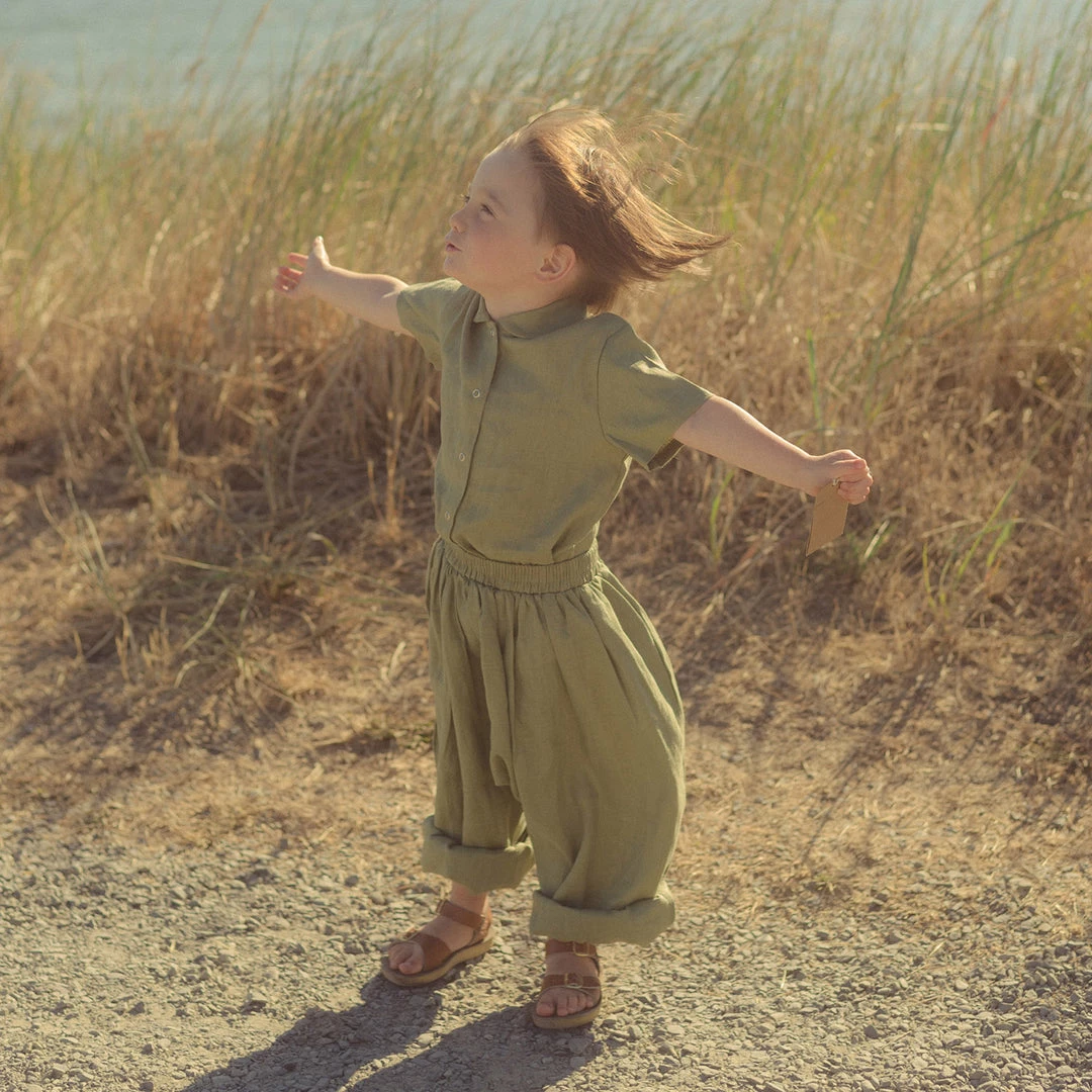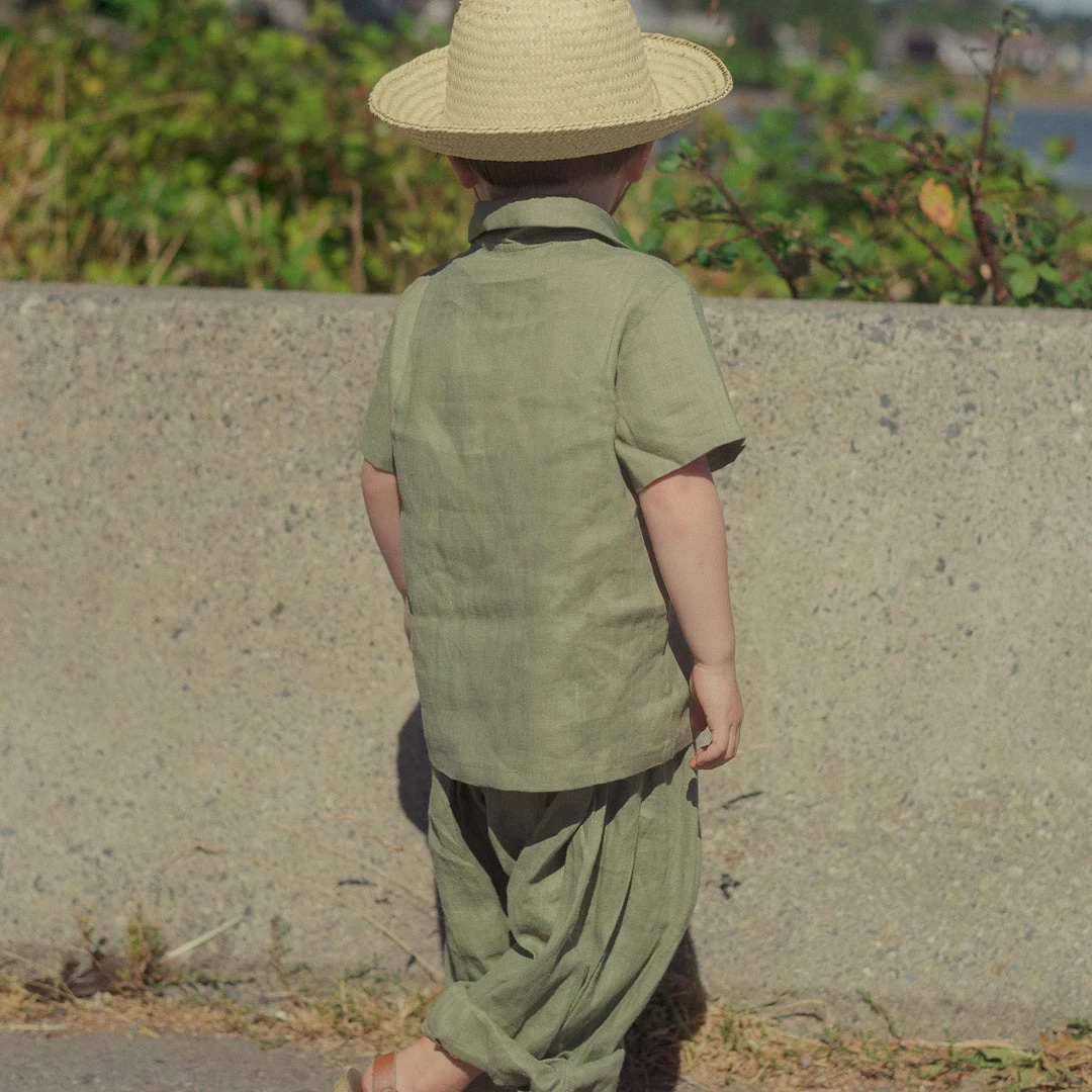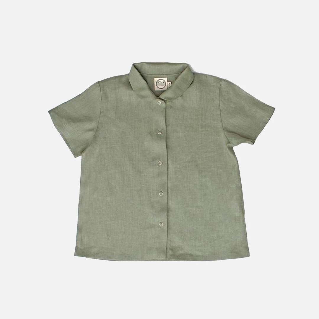 The Short Sleeve Work shirt is a sweet little Peter Pan collared style. Simple snap front fastening so that children can easily dress themselves. Made with french seams throughout.