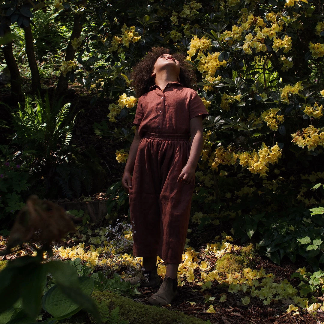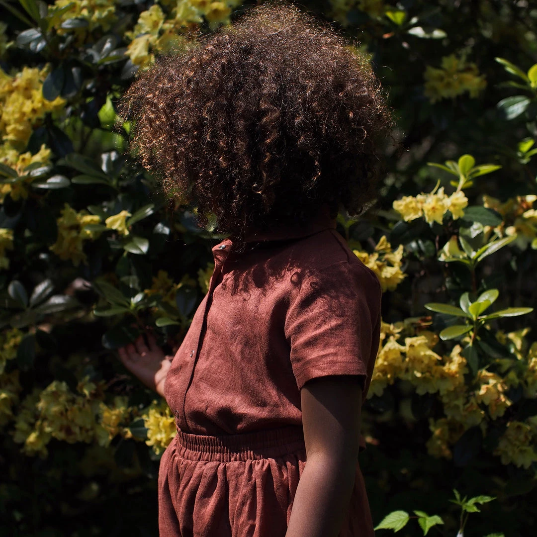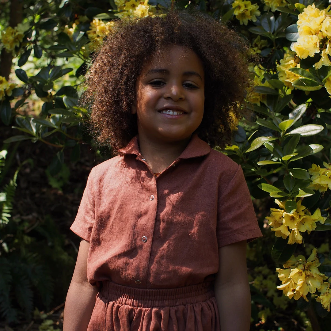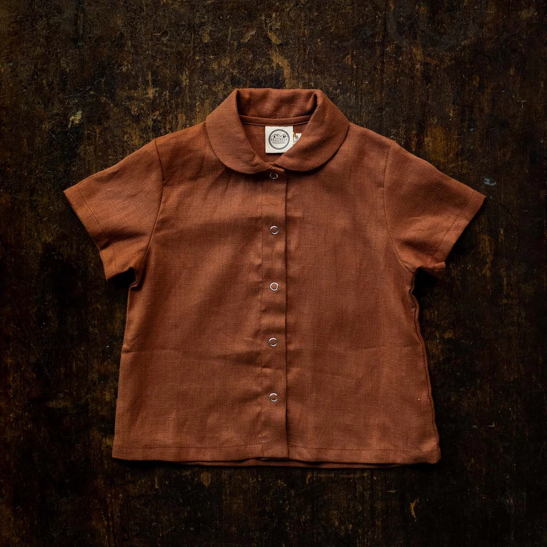 The Short Sleeve Work shirt is a sweet little Peter Pan collared style. Simple snap front fastening so that children can easily dress themselves. Made with french seams throughout.