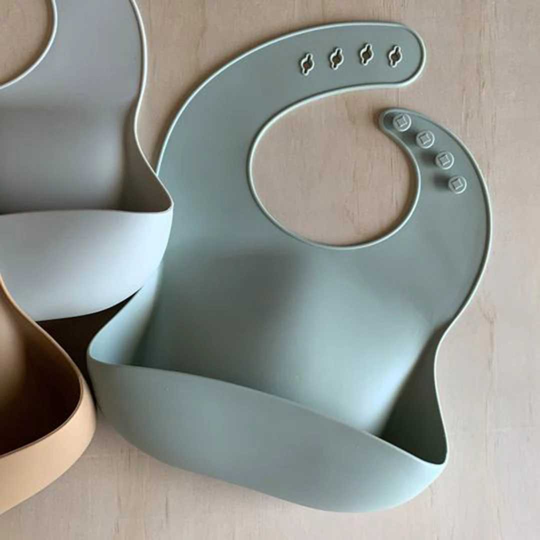 These bibs have a wide scoop bucket to catch all the crumbs and keep outfits clean.