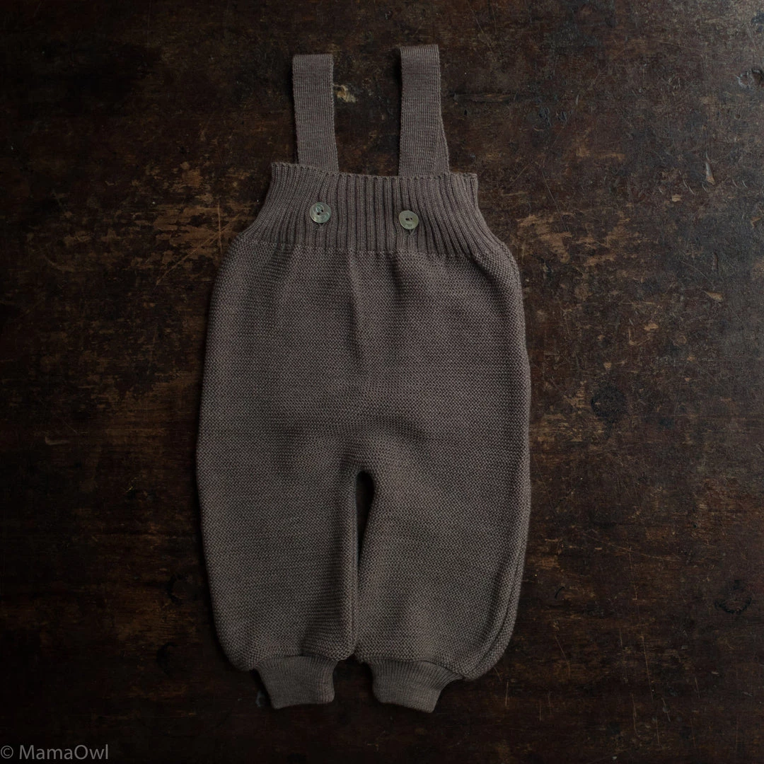 Warm knitted trousers with real seashell buttons. Features an elastic waistband and cuffs that provide a good hold. The special type of knit that grows with your baby. Soft fine Merino Wool, breathable, sweat absorbent and stain resistant.