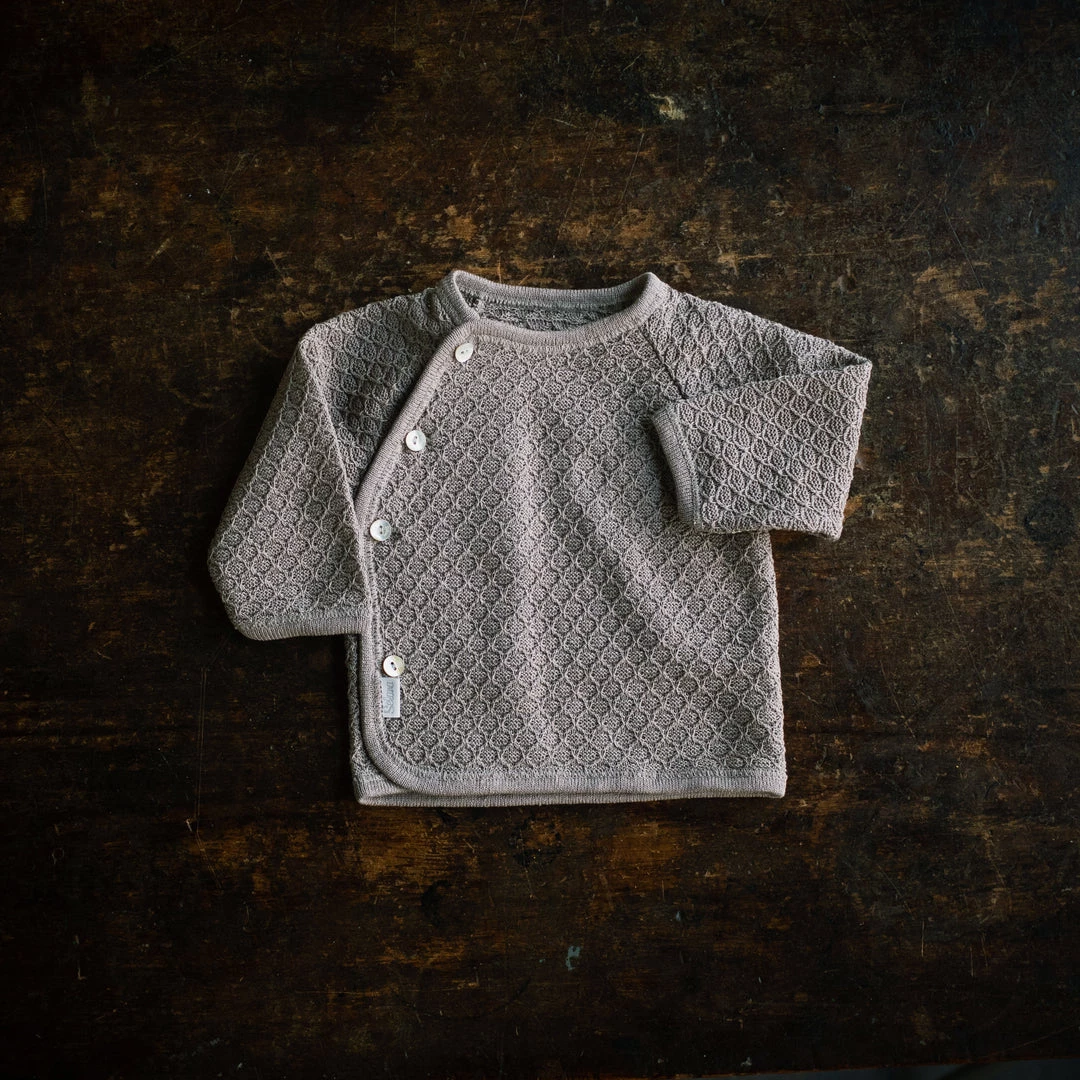 Beautifully flat fine knitted bourette silk sweater/top in natural, this style is known as a swiss schlüttli with side close buttons on the front.