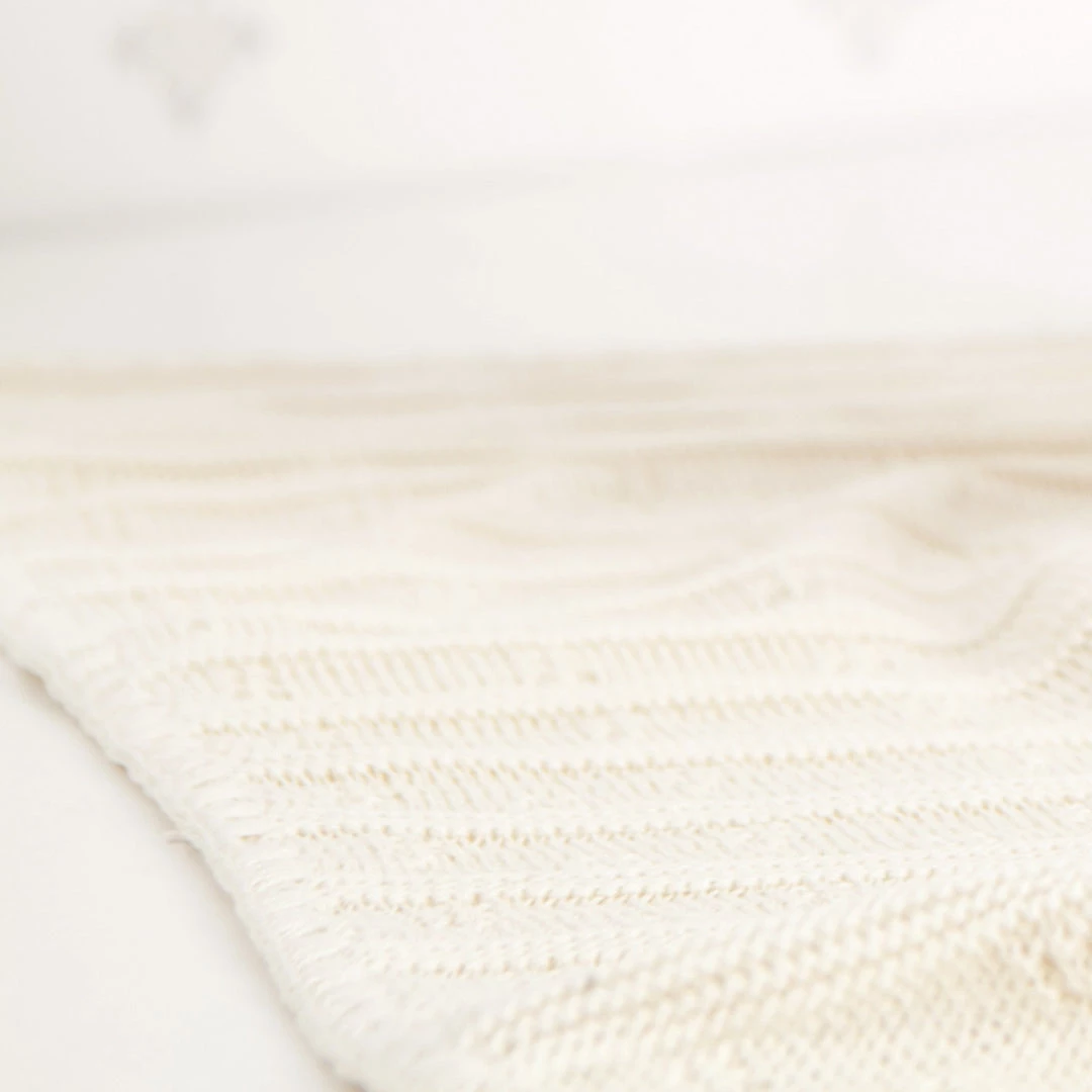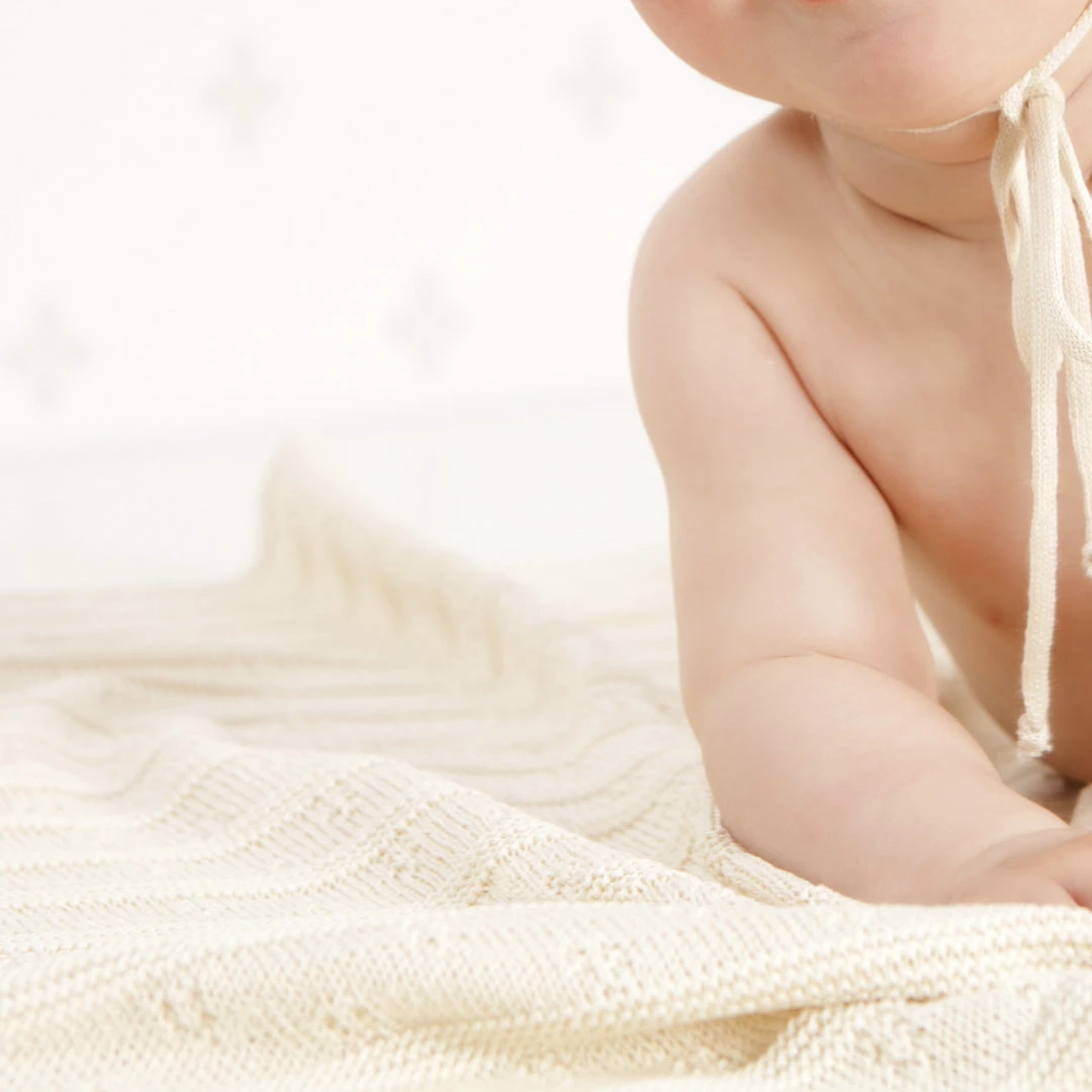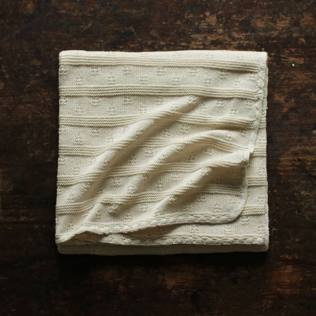 Knitted swaddle/ baby blanket with decorative relief pattern and crochet edges. Bourette silk.