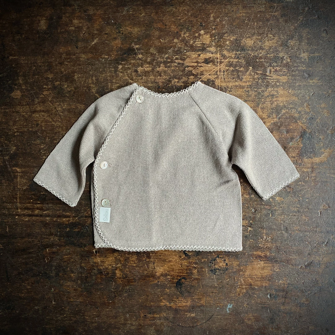 These sweet lightweight cardigans are perfect throughout spring and summer. Flat knitted 100% bourette silk top, this style is known as a swiss schlüttli and has a side closure that can be worn at the front or the back. Features real pearl buttons and a contrast picot edge detail. Suitable for boys and girls.Â