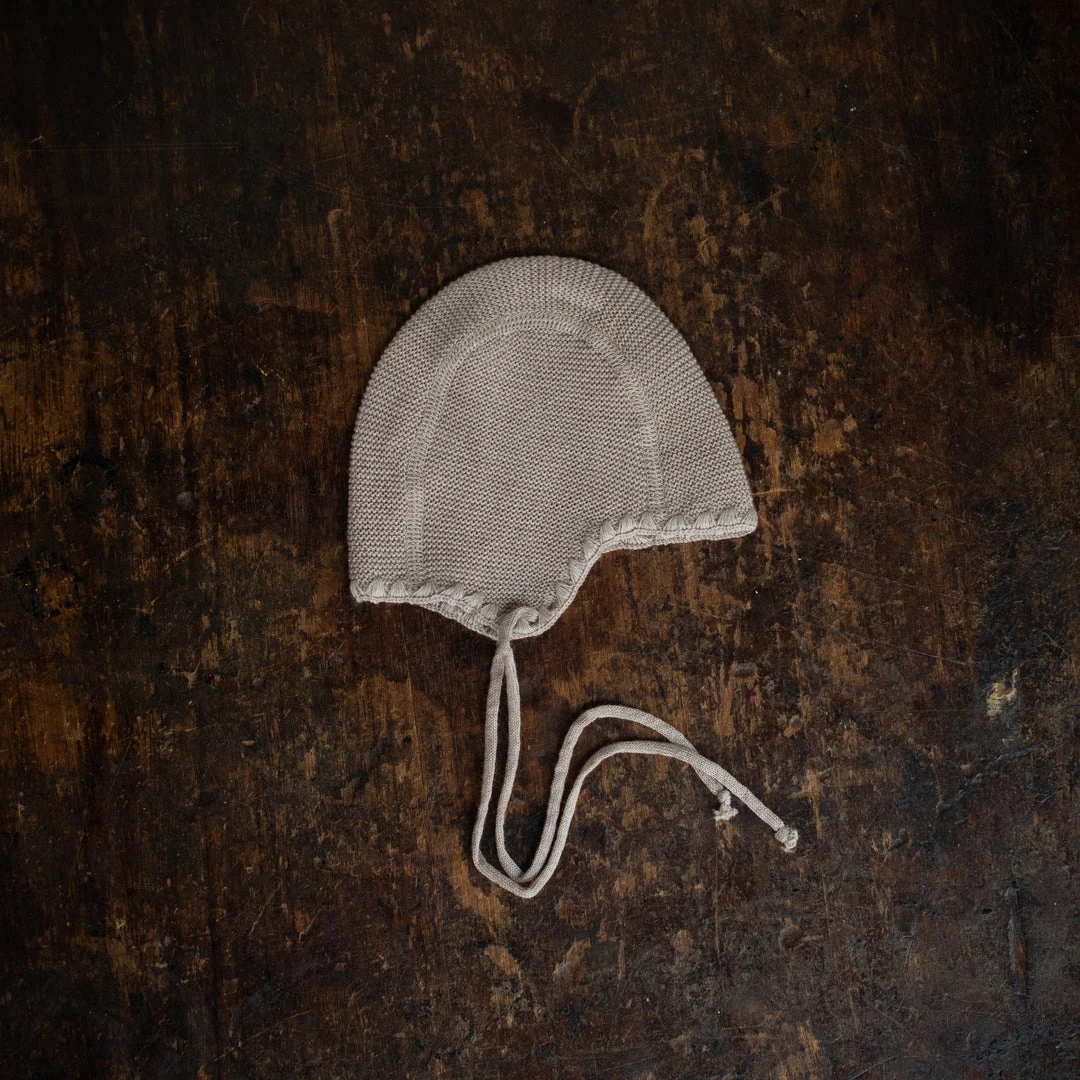 Warm knitted bonnet. The special type of knit that grows with the baby. Very good fit with flat seams. The cords provide good hold.