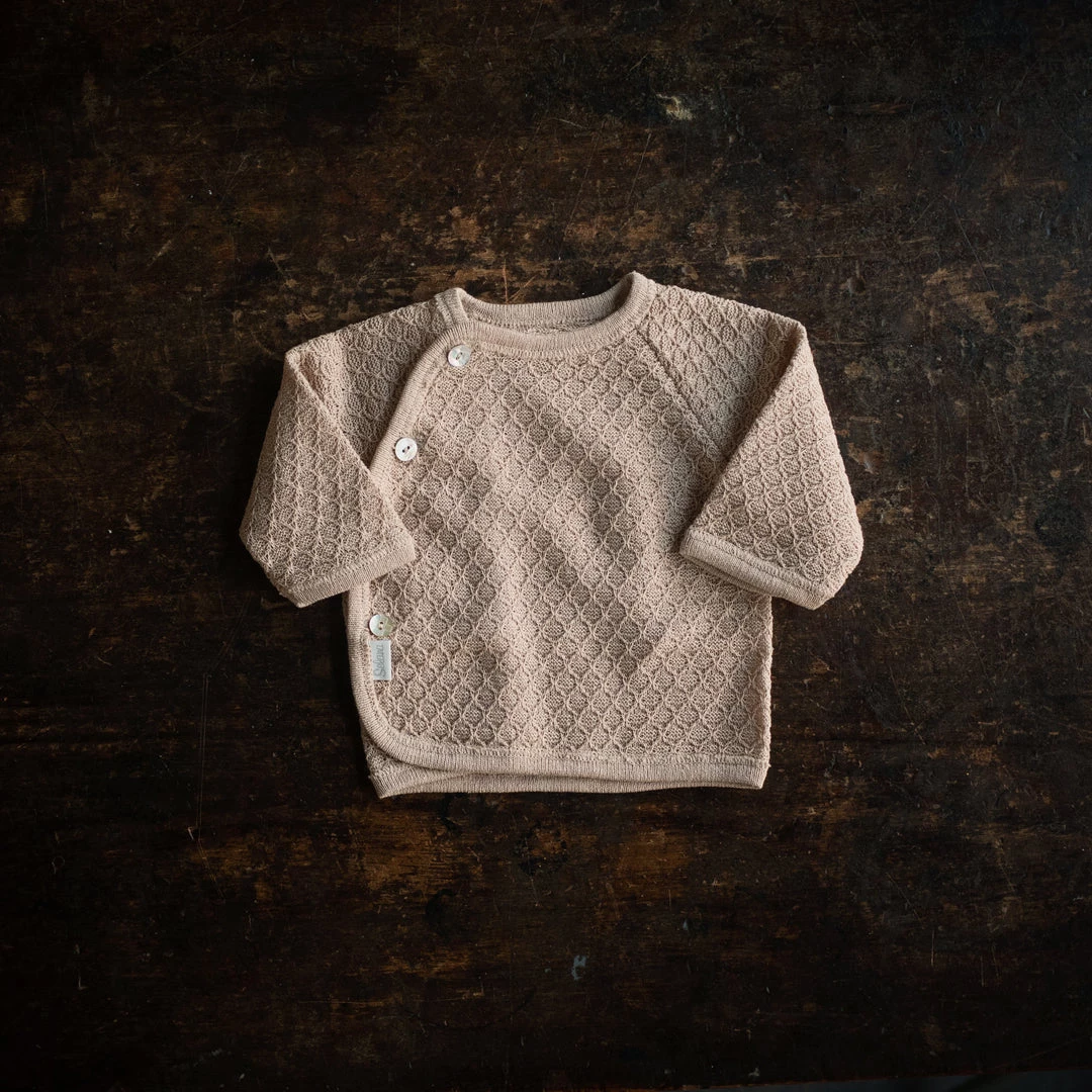 Beautifully knitted cardigan with traditional pattern. Features real seashell buttons. This style is known as a swiss schlüttli with side close buttons on the back but can also be worn at the front like a cardigan.
