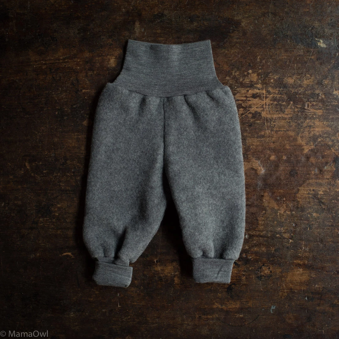 Super soft, comfortable and warm baby pants. These thick wool fleece pants have a soft high waist belly band which makes them perfect for cold days and as an extra layer for babies in slings. Great worn over an everyday outfit for extra warmth through winter. The rib waist band on these pants can be folded down to the hips or left high to cover the tummy.