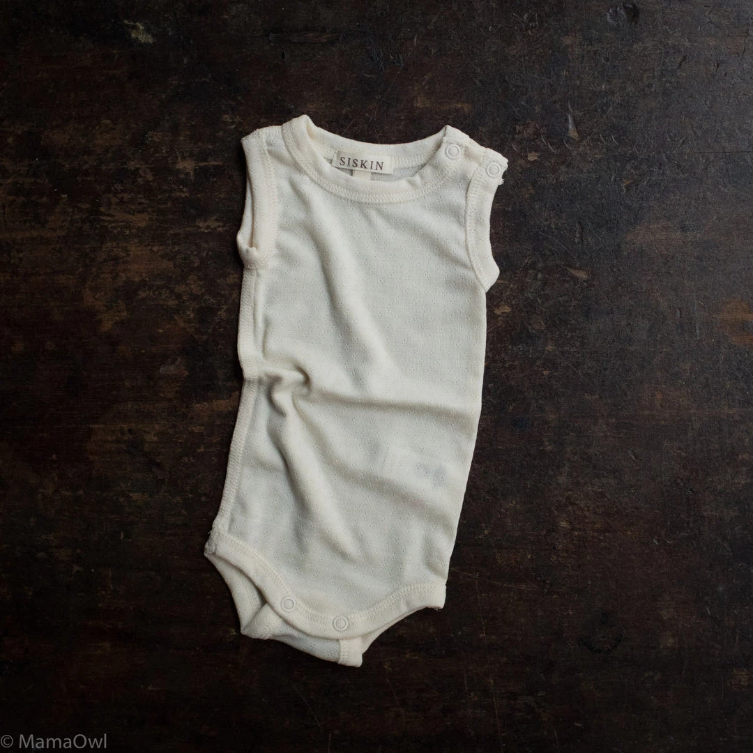 Super soft sleeveless body in wool and silk, perfect weight for all year round. Designed with a subtle pointelle pattern to add texture. Features two snap buttons at the crotch and two on the left shoulder for easy dressing. The perfect base layer with a slim fit.