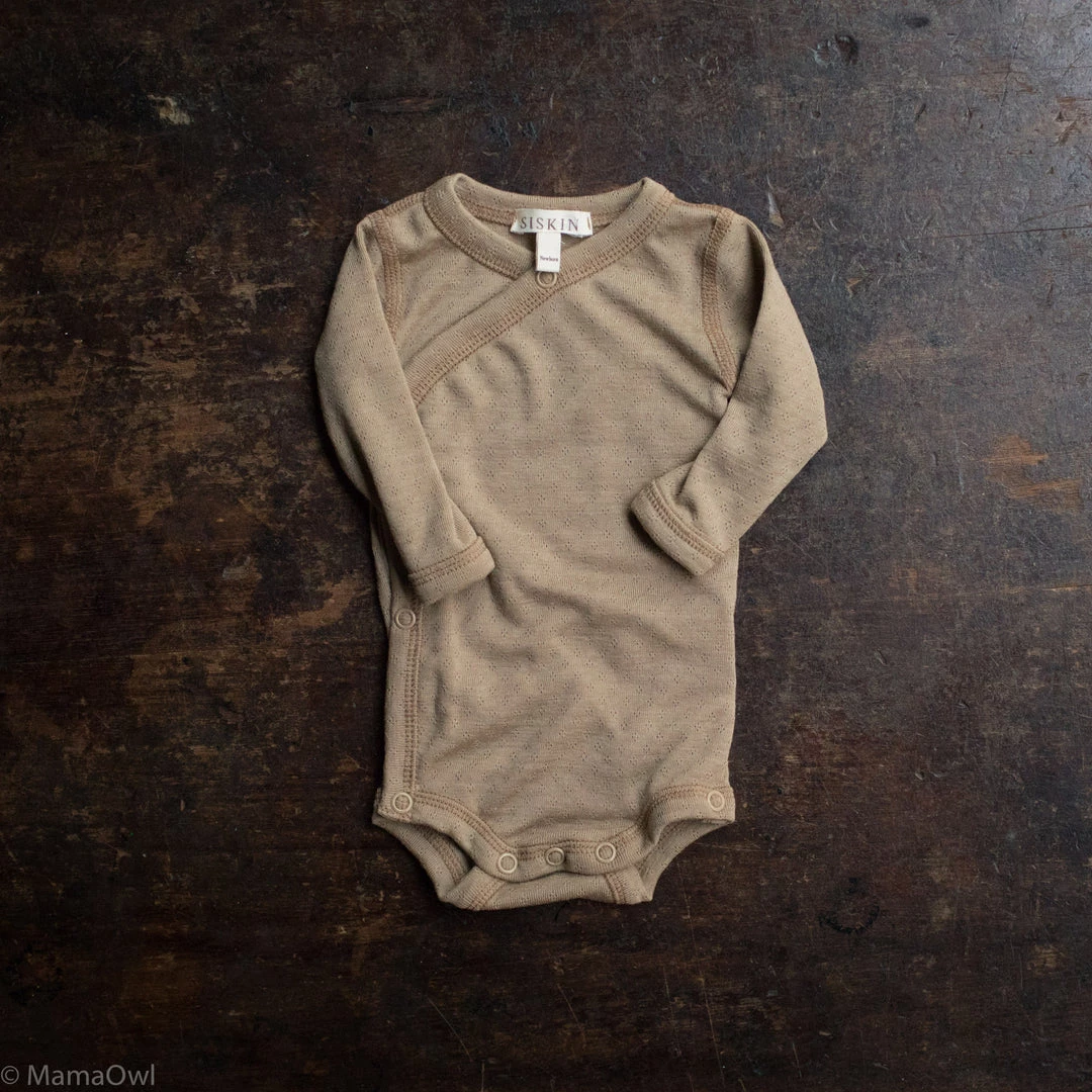 The perfect baby body style as it is easy to open up and dress a newborn. Designed with a subtle pointelle pattern to add texture. Super soft and perfect weight for winter. The perfect base layer.
