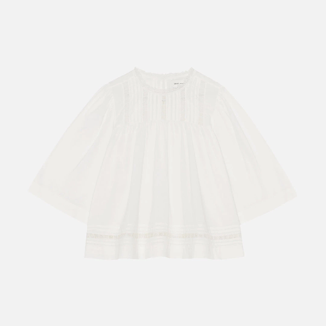 The Cosmos blouse is designed with a round neck, pleat and lace details across the chest and towards the hem. The cotton voile is light and airy and the blouse has a roomy fit. The blouse closes in the back with a delicate keyhole fastened with a button. The sleeves sit at a mid length with a beautiful amount of volume. This blouse is the perfect weight for summer but can be worn all year round when layered with your favourite knits.