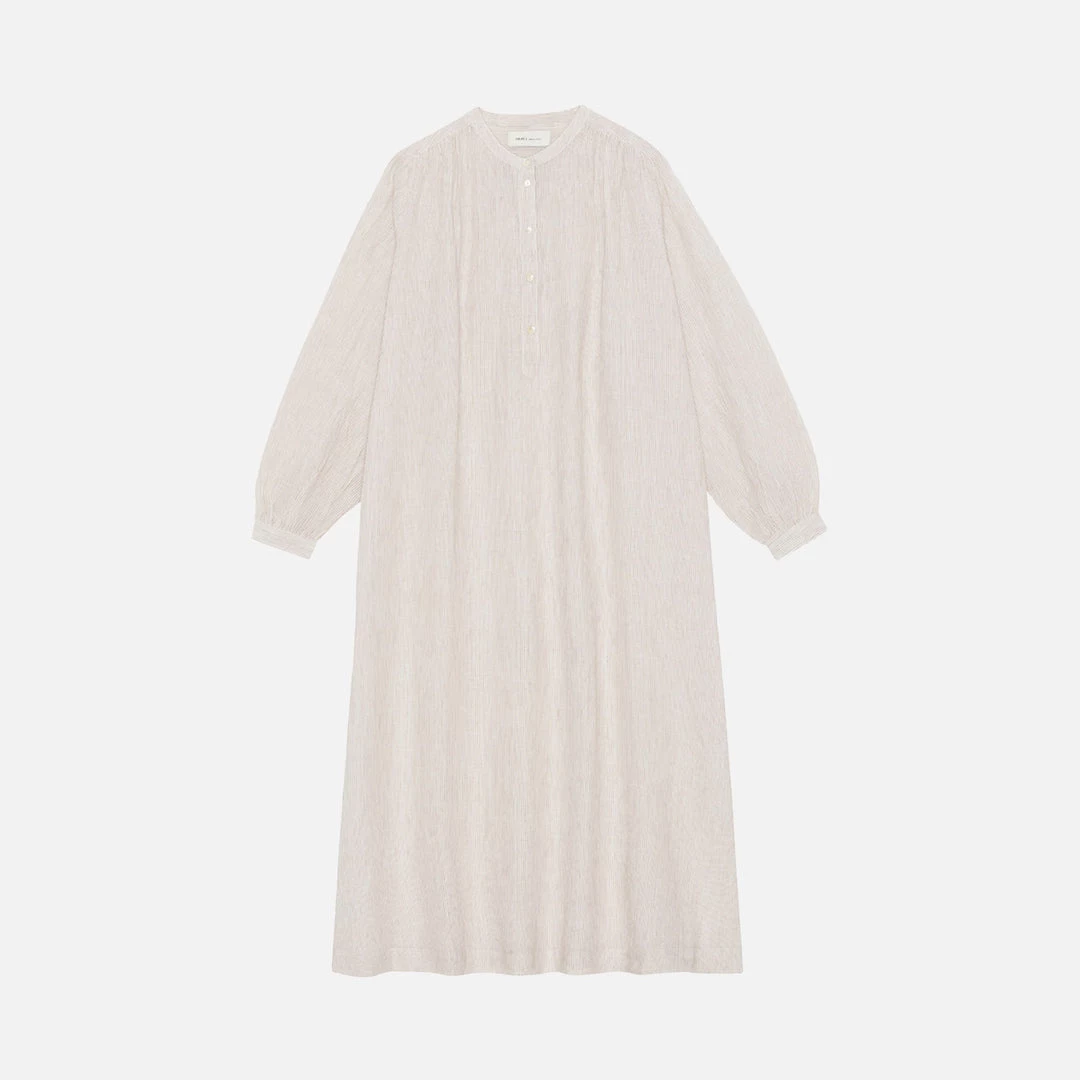 The painter shirtdress is designed with a stand collar that closes with mother of pearl buttons down the front. The dress is made from a neutral toned striped linen. Features delicate pleats both at the front and the back, which gives it a generous volume. Wear this shirtdress with sandals and under a vest for a great spring summer look.