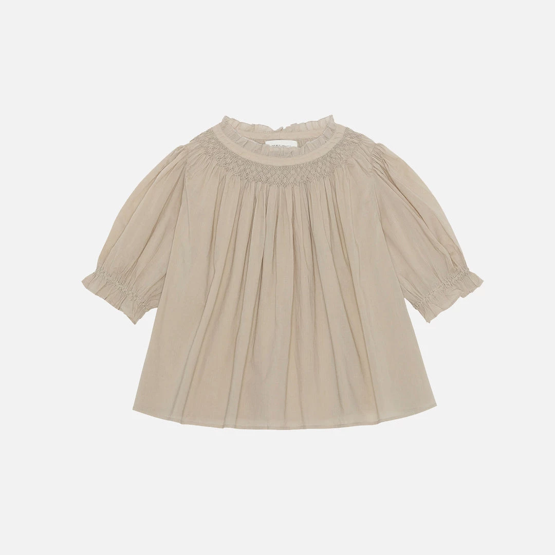 The Daphne tee is an easy to wear garment. Designed with a round neck and ruffle edge detail followed by a simple smocked band to bring volume to the body. It has a wide fit with pleats and the sleeves are 3/4 length with elastic smock and embroidery. It is the perfect summer blouse. Made from an organic cotton voile which has a beautifully light weight.