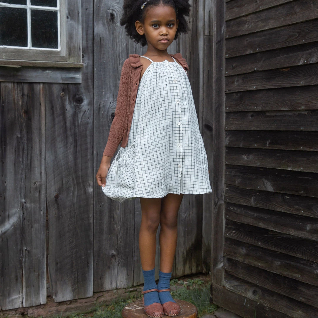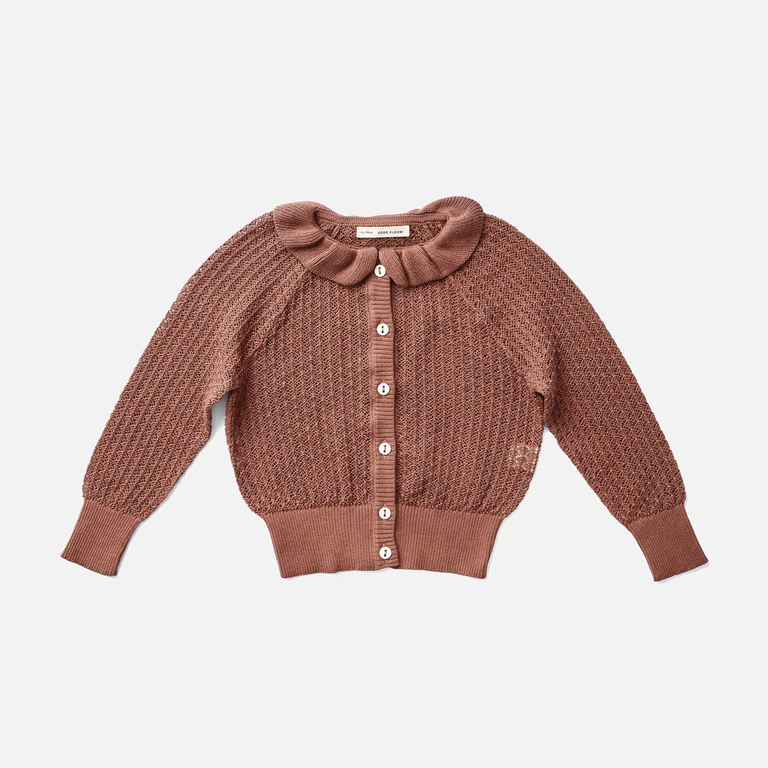 A sweet cardigan in a delicate lace stitch with a ruffled collar. Features natural horn buttons down the centre front fastening. Lightweight and airy. This makes the perfect warm weather layer over skirts, dresses and trousers. Perfect when worn with occasion wear as it adds a little something special.