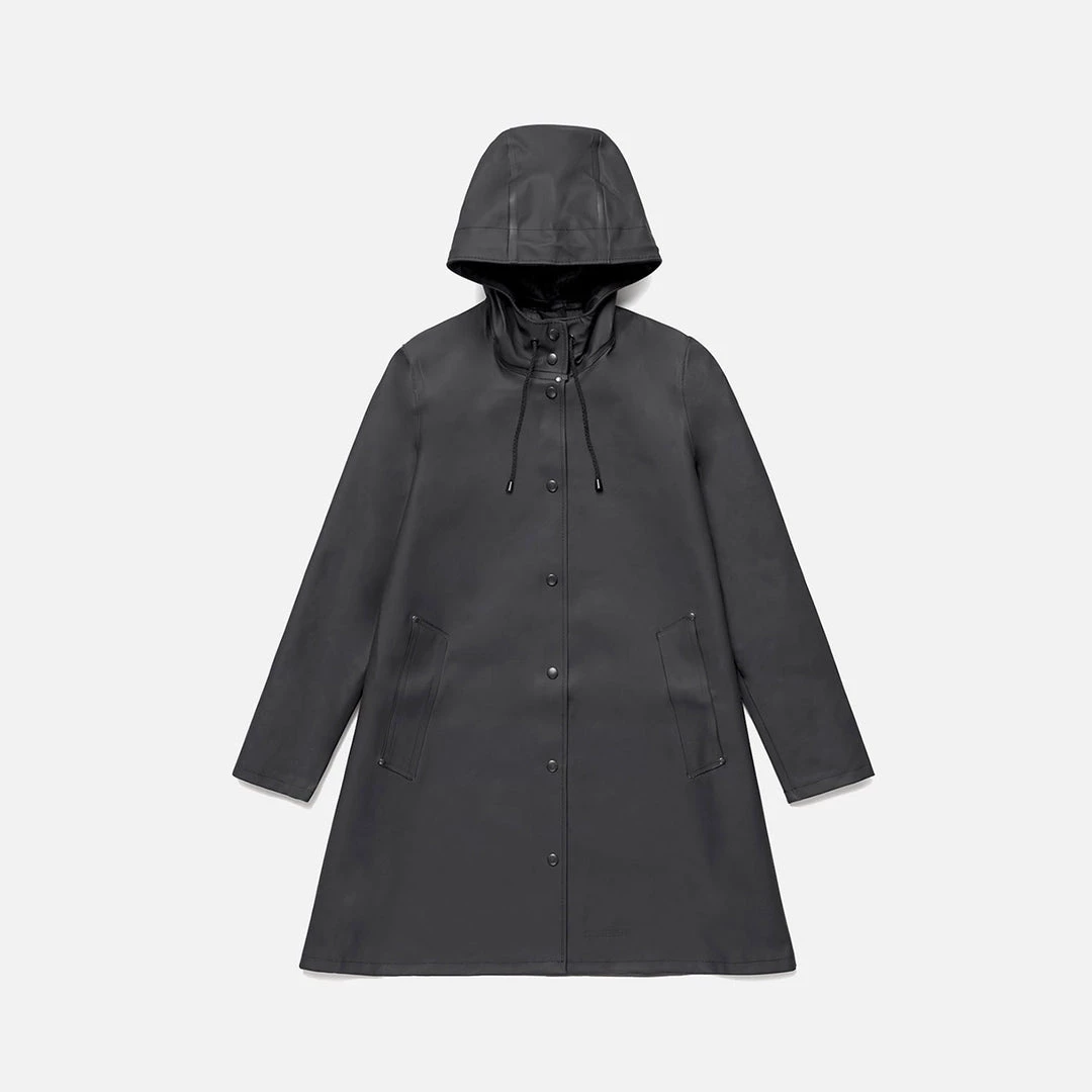 The Stutterheim Mosebacke raincoat is the women’s version of the iconic Stockholm raincoat. Designed with an A-line cut, this raincoat has a very flattering silhouette. This feminine style is handmade in rubberized cotton and comes unlined. The raincoat features double welded seams, snap closure and cotton drawstrings. Stutterheim uses the finest craftsmanship and the quality is clearly evident. On experiencing these garments, you can feel it is a piece designed to last. This raincoat is made in the Classic, Original weight material of 530gm. It is a heavier weight than most raincoats and is really designed to keep you dry, no matter how torrential the downpour. Due to the thickness of the material it is best to keep the raincoat hanging, either on a peg or a coat hanger, when not in use. It is not designed to be packed down inside a bag. If you need a packable raincoat, we suggest choosing one of the lighter weight options from Stutterheim.