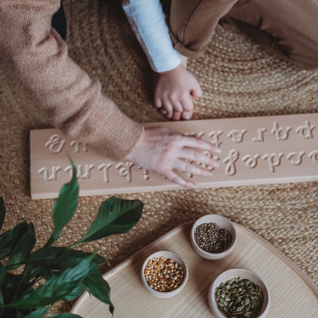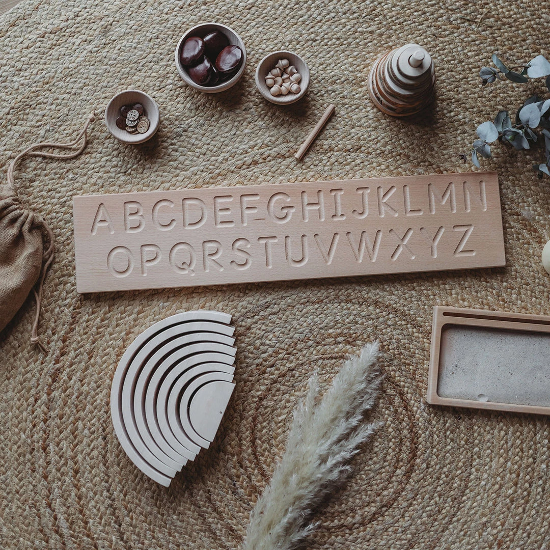 All boards are made from solid beech wood sourced from local wood suppliers in Italy and Germany. They are finished with a natural raw oil. The board comes with a tracing stick which is designed to help develop pencil grip.