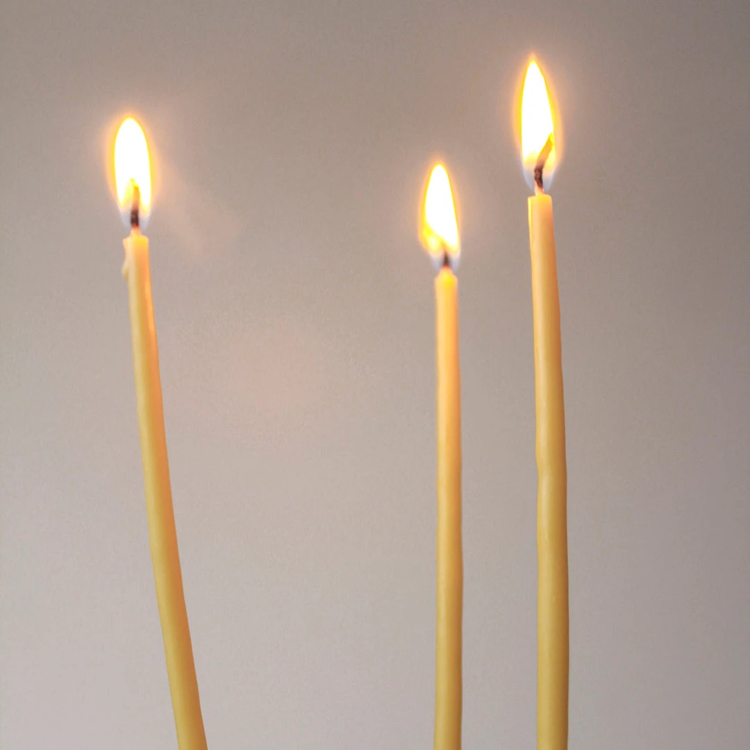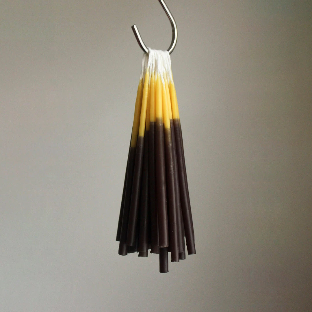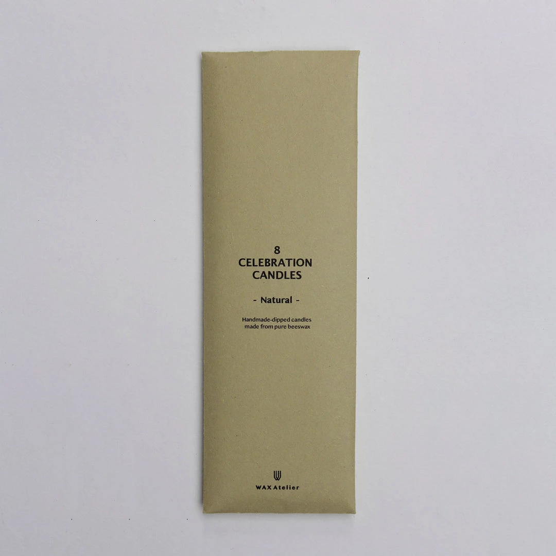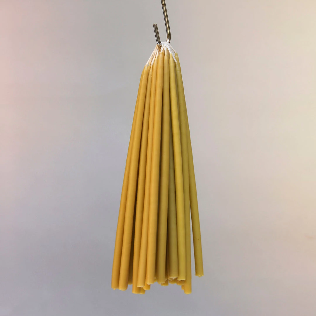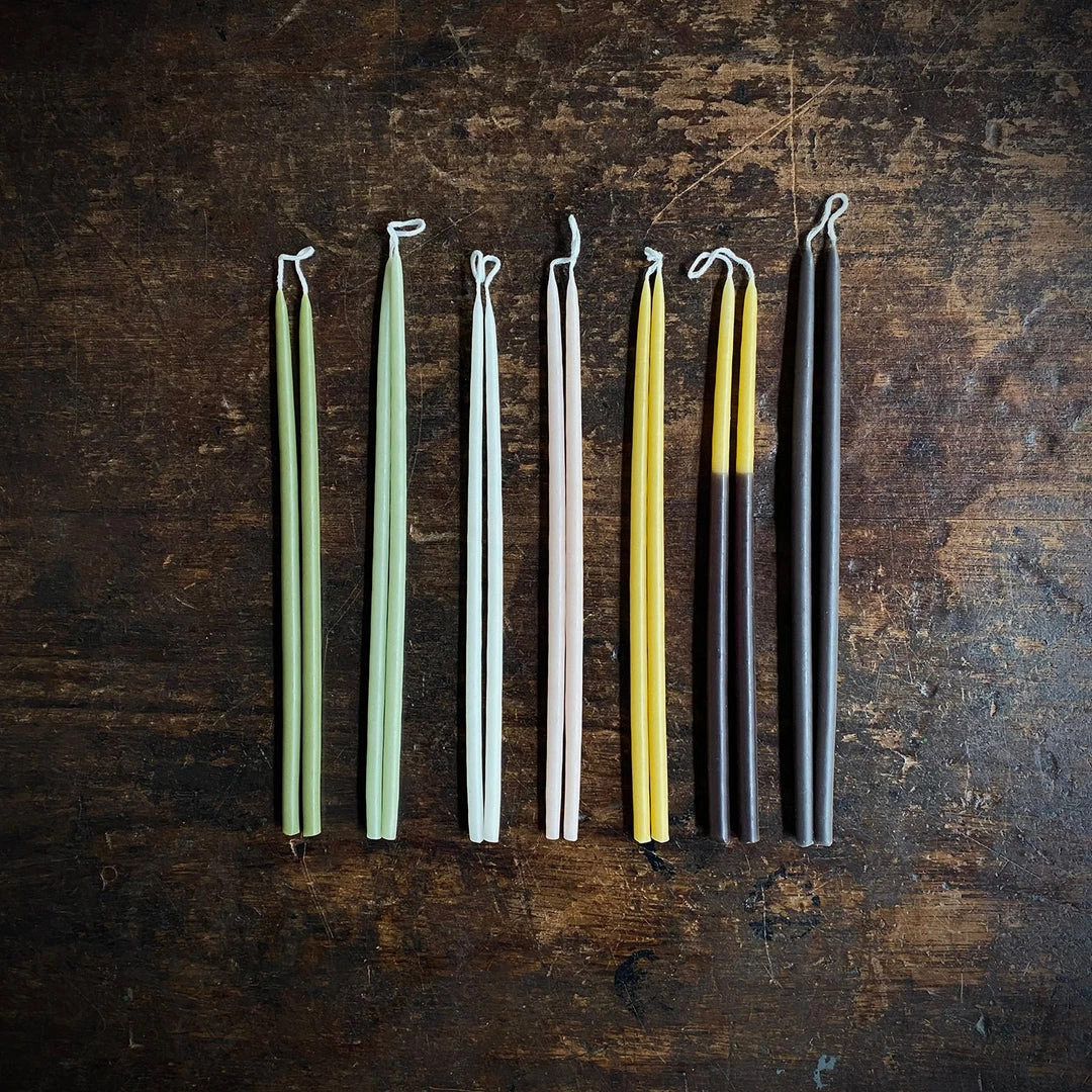 Bundles of 8 celebration candles. Choose from 7 different colours. These naturally coloured, hand-dipped candles are made with a fusion of beeswax and dye. Perfect candles for celebrations or everyday use.