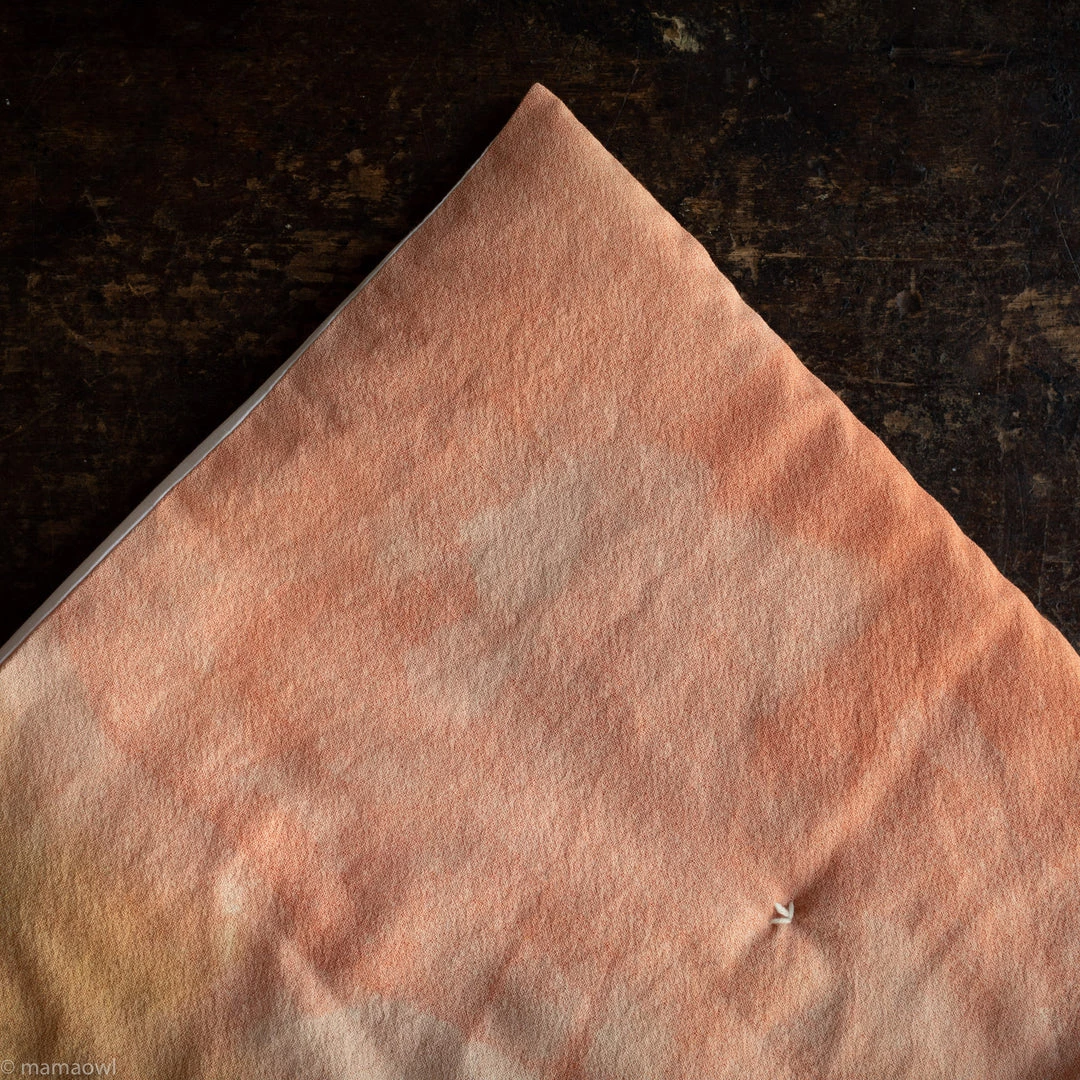 The natural plant dyed colours are blue, ochre and pink on a natural base. Each corner is dyed a different colour with one corner remaining undyed. This technique produces a beautiful watercolour effect across the quilt.