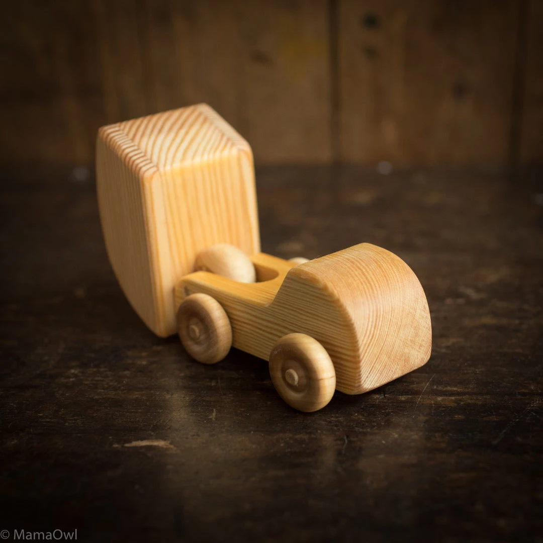 The Wooden Dumper Truck is a four-wheeled hardwood toy, and it is great for vehicle play. The tray tilts so it can empty the load.